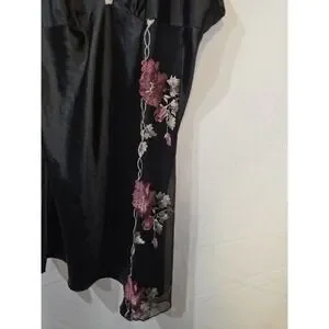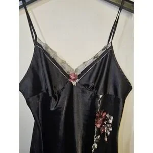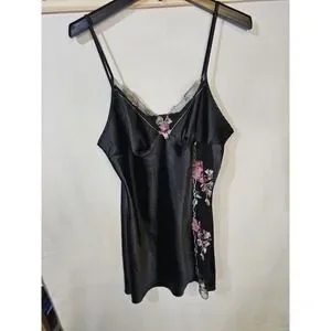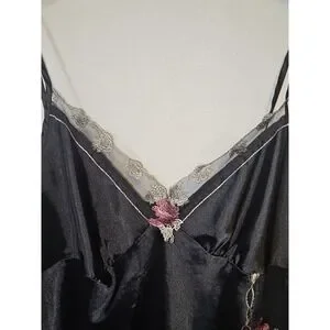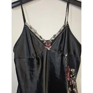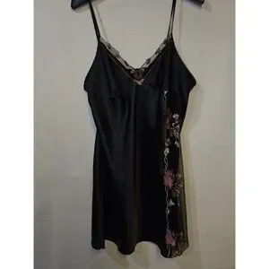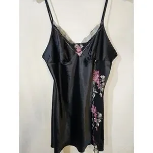 This is a mid thigh black satin chemise (or slip dress) featuring lace detail in size XL. Made of polyester satin fabric with a sleeveless design and V-neckline, this dress exudes elegance and sophistication. The embroidered lace accents add a touch of romance, making it perfect for the summer and spring seasons. Designed specifically for women, this chemise is a luxurious addition to any sleepwear collection, requiring hand wash care to maintain its quality. Perfect for those looking for a comfortable yet stylish option for bedtime or lounging.