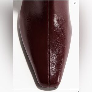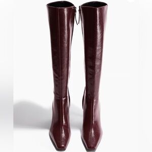 H&M knee-high heeled boots in a deep burgundy tone with a sleek pointed toe silhouette. Designed with a slim mid heel and inner side zip closure for a clean, streamlined look. A sharp, polished boot that elevates dresses, tailoring, or minimal winter layers.