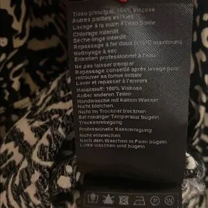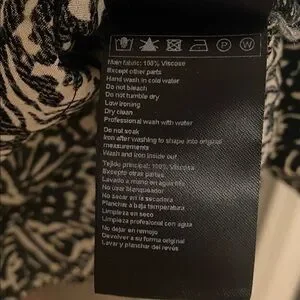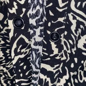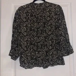 Stylish black and white patterned blouse paired with black leather pants. Perfect for a chic look.