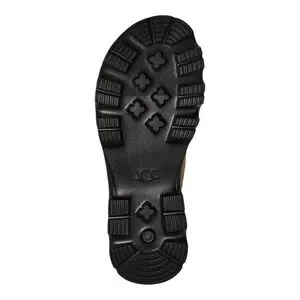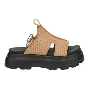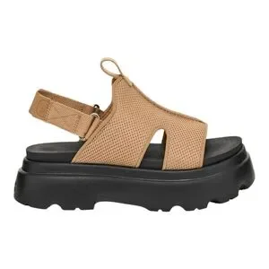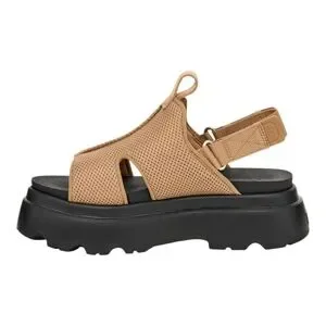 Stylish UGG sandals with a chunky black sole. Breathable tan upper for comfort.