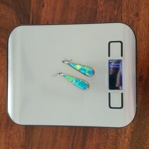 A rare pair of vintage modernist earrings crafted in Sterling silver with vibrant modeled enamel in turquoise blue, green, lime and lemon tones. The elongated teardrop silhouette and art-driven color work give them a sculptural, gallery-worthy feel that elevates everything from minimalist outfits to boho layers.