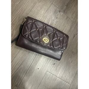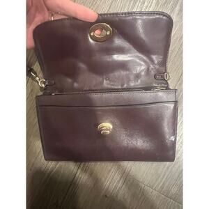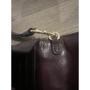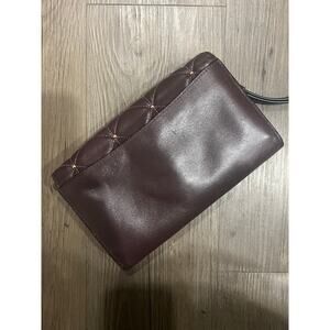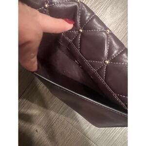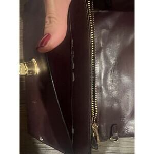 Burgundy, has some peeling in a couple spots shown it the pictures and normal wear/ scratches from use. Great bag for fall. Has the loop to add a chain.