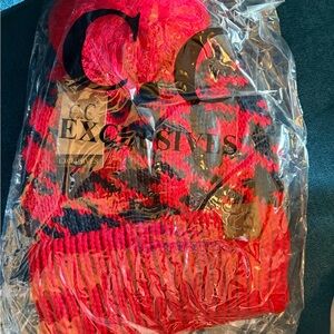 Eye-catching red and black knit beanie. Ideal for chilly days.