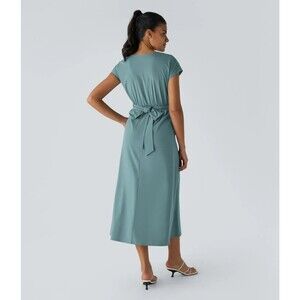 Stretchy & lightweight Halara Breezeful v neck tie back dress in dove gray. These dresses can be dressed up or down and feature pockets & long ties that can be worn several different ways.