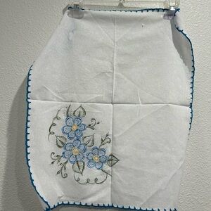 Elegant white handkerchief featuring beautiful blue floral embroidery and hand crochet border. New with slight imperfection. Can also be used as a a tortilla warmer. 21” x 18”