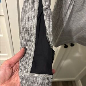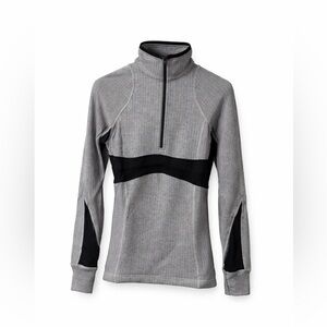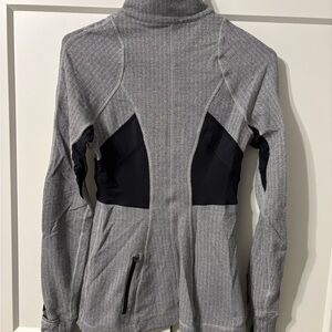 Flattering and functional Lululemon long sleeve running top in classic grey herringbone with black contour panels.