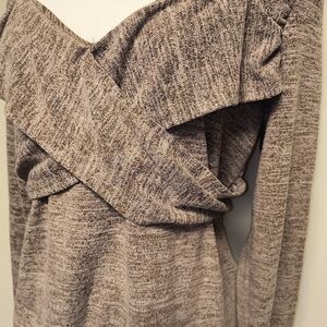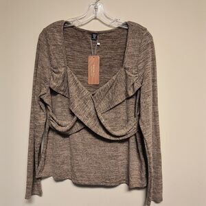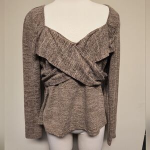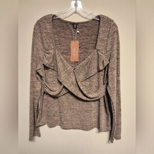 Chic taupe knit top with Criss Cross detail and long sleeves. Perfect for versatile styling. Thin Sweater Like Material has Stretch.