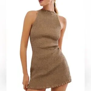 Free People Iyla Smocked Bodycon Mini Dress XS Tan Retro Square High Neck