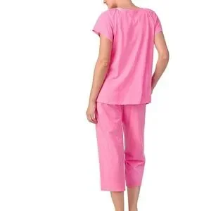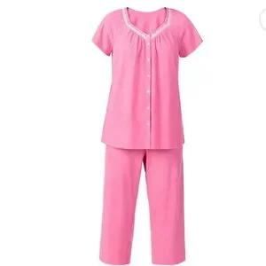 • Features: Aria Women's 2PC PJ set, 100% BCI Cotton knit fabric, portrait neck with short raglan sleeves, button front, lace details, side seam pockets