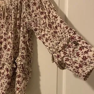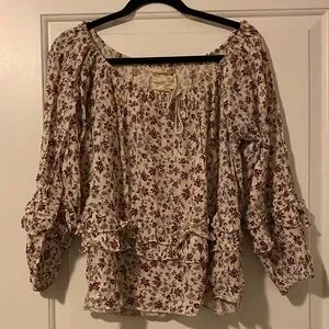 Chic off-shoulder blouse with floral pattern. Features ruffled sleeves and hem. Perfect for casual elegance.