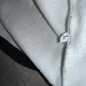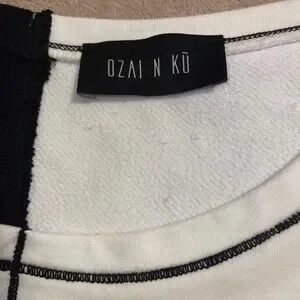 Ozai N Ku sweatshirt showcases a striking colorblock design with a mixed-media construction, featuring a ribbed black panel alongside a crisp white graphic section. The front is adorned with artistic, marbled teardrop and circular motifs, while contrast stitching defines the asymmetrical seams and neckline. This long-sleeve top offers a relaxed fit with a unique split-hem detail, blending modern art aesthetics with comfortable, casual wear.