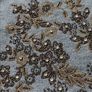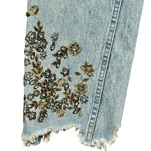 Denim beaded embroidery embellished floral distressed boho bohemian festival metallic straight high rise cropped