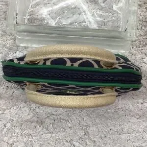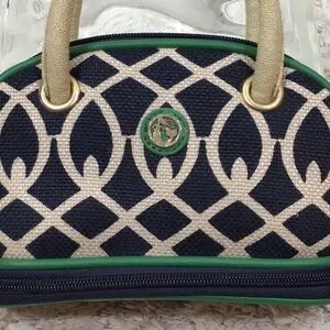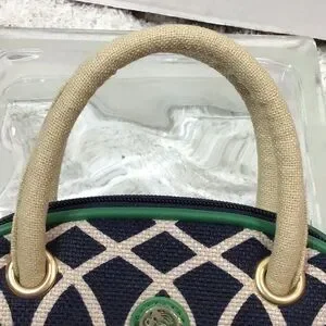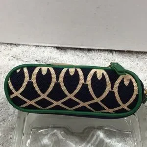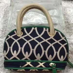 Spartina quality all the way, classic colors navy blue, green, and tan, linen and smooth leather, meant to be a cosmetic bag with the zippered section at the bottom for brushes, etc but why? So cute you should use it as a mini bag for date night, put your keys and cash in the bottom, 8” wide x 5” tall, excellent condition (B-3)