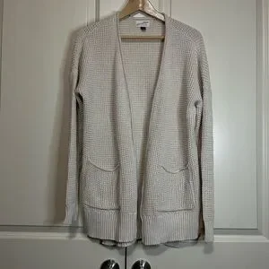 Chic and cozy light beige cardigan. Ideal for layering. Features front pockets.