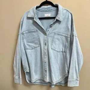 Its a knit denim french terry fabric. This relaxed shirt jacket can be worn open or buttoned for a versatile layer you'll want to live in all year.
