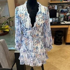 Step out in style with this elegant long sleeve dress, featuring a beautiful floral pattern in blue and orange. Perfect for any occasion.