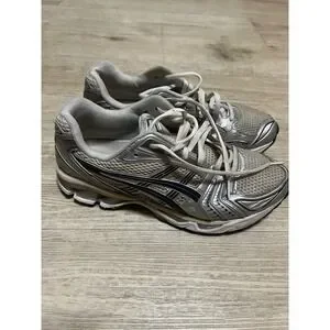 Asics Gel-Kayano 14 running shoes in a striking metallic silver and cream colorway. These performance-focused sneakers feature breathable mesh uppers with synthetic metallic overlays for a Y2K-inspired aesthetic. Equipped with signature Gel cushioning technology in the heel and forefoot for superior impact absorption, they offer a comfortable ride for both running and casual wear. The design is finished with the iconic tiger stripes on the sides and Gel branding on the heel. Note some visible wear on the midsoles and outsoles consistent with previous use.