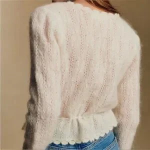 This beautiful cream cardigan offers a delicate and feminine touch to your sweater collection. It’s so lovely, combining comfort with style - and it’s Sezane. 17” ptp.