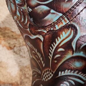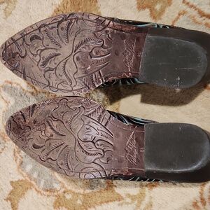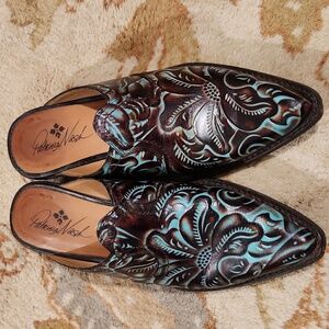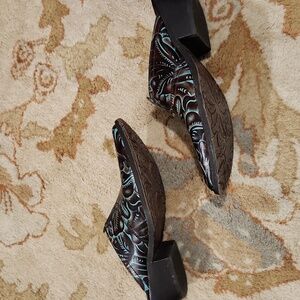 Step out in chic Western style with these stunning Patricia Nash Battista mules! Crafted from rich, tooled leather in a beautiful turquoise and brown floral pattern, these pointed-toe slip-ons are perfect for any festival or a stylish everyday look. They offer both comfort and a unique, eye-catching design. Gently worn.