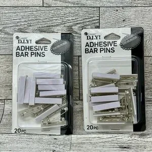 The image shows 2 packages of Cousin D.I.Y! Adhesive Bar Pins, containing 20 pieces. These adhesive-backed metal bar pins are designed for various DIY crafts, such as creating custom brooches, badges, ribbons, and name tags.
