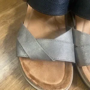 Elegant Sofft sandals with black and silver straps. Comfortable and stylish for any outing.