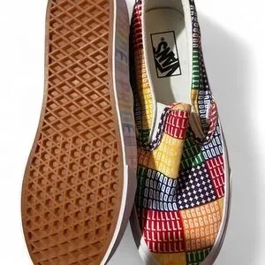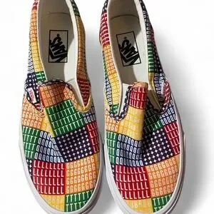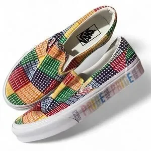 Vibrant slip-on sneakers with a multicolor pattern. Features 'Pride' text. LGBTQ