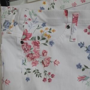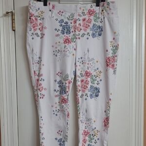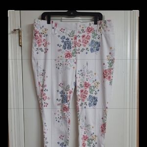 Chic capri collection, bundle of 3 pants, all are size 16/1x. Three styles. great for spring/summer. Features pretty floral on white background, classic denim blue, and dusty rose pink cargo pants. Ideal for everyday style.