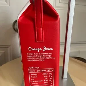 Fun crossbody bag with an orange juice theme. Features vibrant red and white colors.