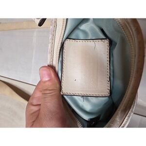 Coach crossbody bag features the iconic signature C monogram canvas in a brown and cream colorway with white leather trim. Designed for daily utility, it includes a front pocket with a turn-lock closure and a secure top zip that opens to a light blue satin-lined interior. The adjustable canvas strap allows for comfortable crossbody wear, accented by silver-tone hardware and the classic Coach hangtag. Please note significant wear and peeling on the leather piping and trim as shown in photos.