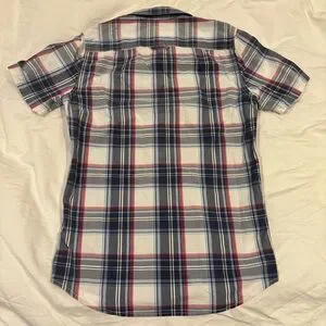 “The Washbasket Shirt” is a button down, short sleeves, with two breast pockets (one pocket has small stain, see pictures), 100% cotton, pattern is white, blue, red and grey. Nice thick material, not see-through