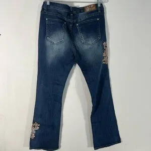 New with tags Grace in LA Easy fit bootcut jeans in size 34. Dark vintage wash denim with floral embroidery on side and bottom of leg. Rise 11” and inseam 33”.