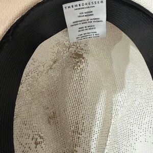 Elegant white and tan hat featuring a black leaf design. Perfect for a chic look. It’s a hand painted beautiful hat