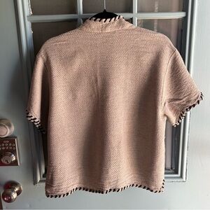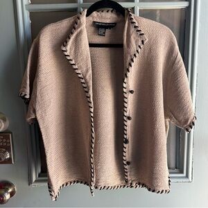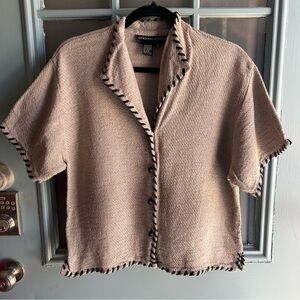 Vintage Retro Boho Knit Stitch Hem Linen Woven Short Sleeved Casual Button Up M