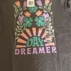 Red tee with Paris-themed graphics. Gray tee with floral and 'Day Dreamer' design. Both t-shirts are juniors size small and brand new with tags.