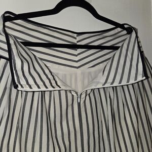 It features a crisp navy and white striped pattern with a unique chevron-style waistband that transitions into elegant pleats.