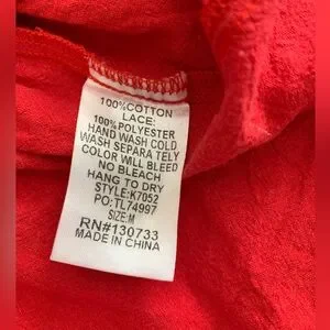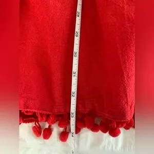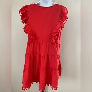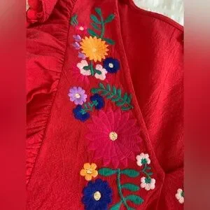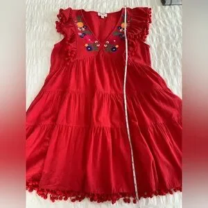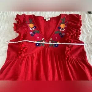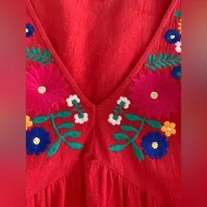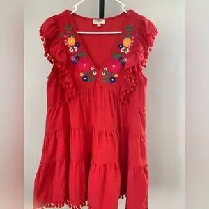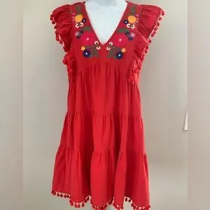 Vibrant red dress featuring colorful floral embroidery on a v-neck and playful pom-pom accents. Perfect for a lively look. Size medium is 100% cotton and the embroidery is 100% polyester.