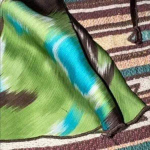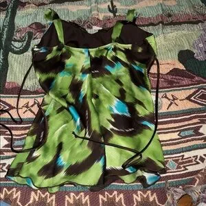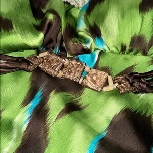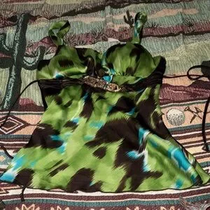 Chic camisole featuring a bold green and brown pattern Accentuated with blue highlights and a stylish belt. Padded top