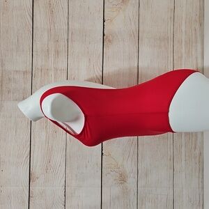 Stylish red one-piece swimsuit. Perfect for beach days.