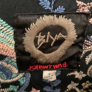 Johnny Was “Violetta” embroidered kimono cardigan jacket in black with stunning multicolor bird and floral embroidery throughout. Features an open front silhouette, long sleeves, detailed cuffs, and intricate vertical embroidery panels on front and back. Statement piece with luxe boho vibe.