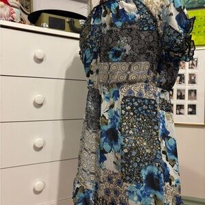 Embrace elegance with this floral patchwork blouse, featuring a stunning blend of blue, black, and white. Perfect for any occasion.