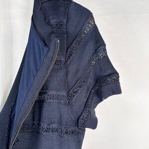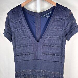 Fully lined navy blue dress with stretch. Short sleeve with sheer details. The material is substantial, classic French Connection.