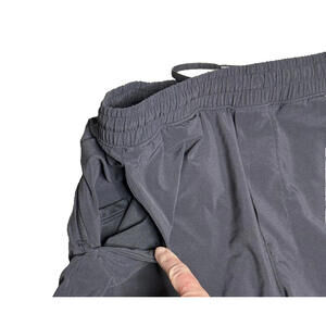 The Lululemon Men's S Pace Breaker Black Linerless Shorts are designed for athletic and gym activities, featuring a solid pattern with a drawstring closure for a comfortable fit. Made with a blended fabric, these shorts have a 7-inch inseam and are machine washable. The black color and athletic fit make them suitable for outdoor sports and training, while the pockets add functionality. Perfect for summer and spring seasons, these shorts are a versatile element for any man's activewear wardrobe. Gently worn and in very good condition. The shorts have a tiny white spot and a pinhole, both pictured. No other signs of wear. Smoke-free, pet-free home.
