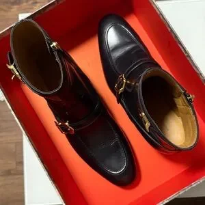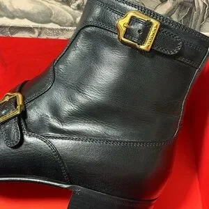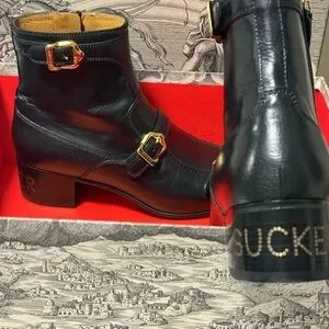 Gucci boots in all leather with gold tone hardware, new condition, only try on wear. Comes with designer box and dust bags with detailed design. Rare piece to come by and especially in this condition. Size 9.5 Gucci.