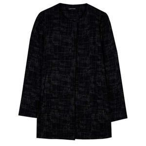 Elevate your style with this designer Eileen Fisher jacket in black. The jacket is made from a Tencel organic cotton blend with a textured finish. The mid-length jacket features an open front design with long sleeves and a regular fit, making it perfect for any occasion whether it's a party, casual or business.The jacket has a stretch feature, ensuring comfort and easy movement, while the cotton blend lining ensures durability. This jacket is the perfect addition to your winter, fall or spring wardrobe. With its classic style and designer brand, you can't go wrong with this jacket!