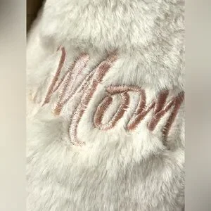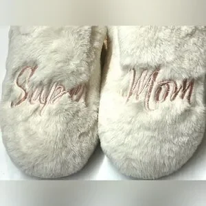 Cozy plush slippers with “Super Mom” embroidery. New with Tags.