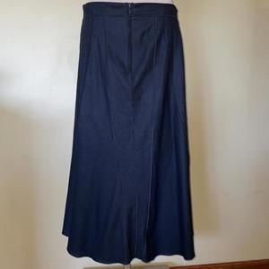 Skirt is flared with center back zip and top button.