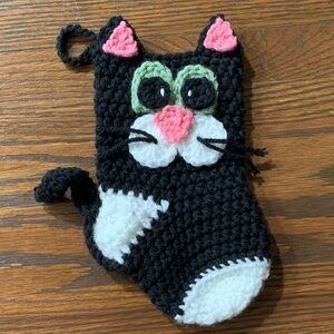 This delightful crochet cat stocking features a playful black and white design with pink accents, perfect for your feline friend. Crafted with care, it's a wonderful addition to any cat's collection.