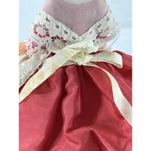 Vintage 6” European folk costume souvenir doll featuring lace shawl and bonnet, gold-tone cross necklace, brocade apron panel, and red skirt with gold trim.