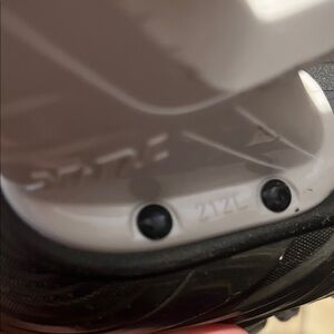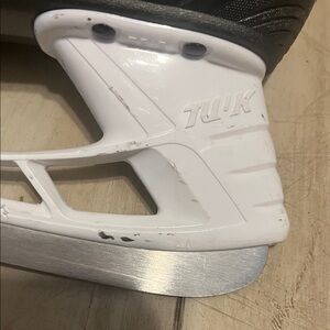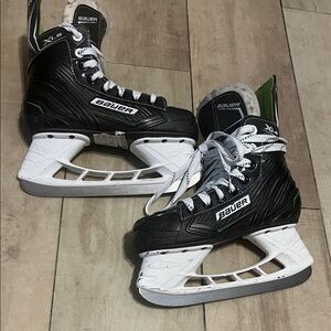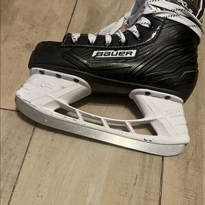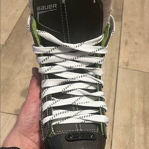 Bauer hockey skates featuring a black and white design with green accents. Offers robust build and modern style. A marking of 2 1/2L indicates your hockey skates are a Junior size 2.5 with a "Large" or wide width. Because hockey skates run larger than street shoes, this size typically fits someone who wears a US shoe size 4.5-5.