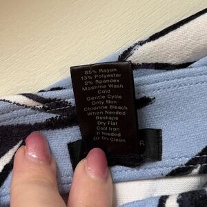 Chic A-line skirt with a bold leaf pattern. Light blue base with white and black accents. Ideal for casual outings.
